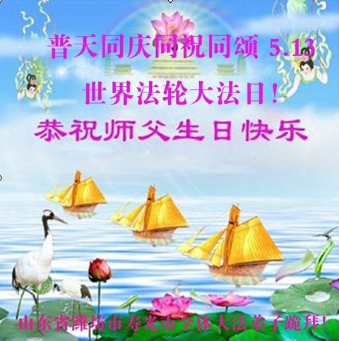 山东省潍坊市寿光市上口镇全体大法弟子恭祝慈悲伟大的师尊生日快乐!普天同庆恭贺5.13世界法轮大法日!