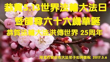 河北石家庄市大法弟子恭贺5.13世界法轮大法日暨师尊华诞!恭贺法轮大法洪传25周年!