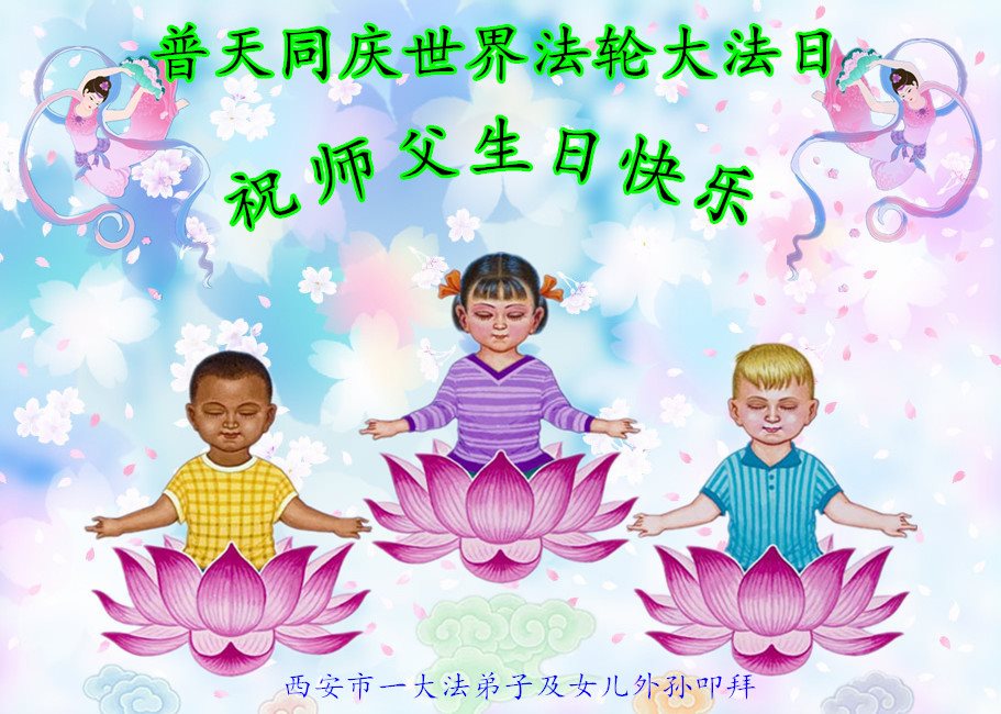 普天同祝同庆同颂世界法轮大法日! 祝师父生日快乐! 西安市一大法弟子及女儿外孙叩拜 陕西西安市一夫妻大法弟子恭贺法轮大法日恭祝师尊生日快乐!