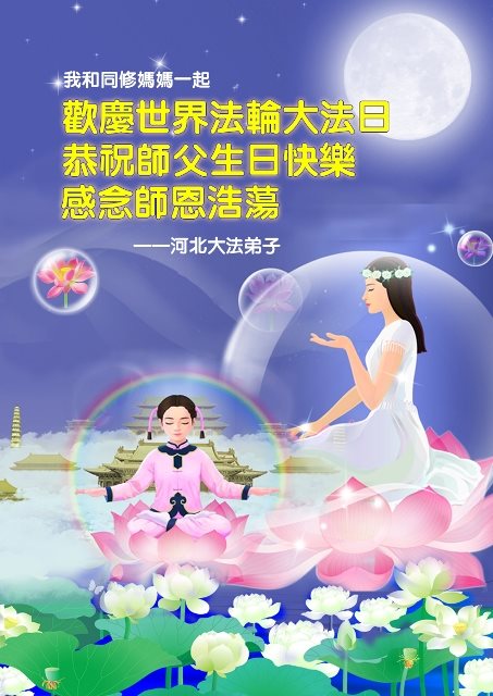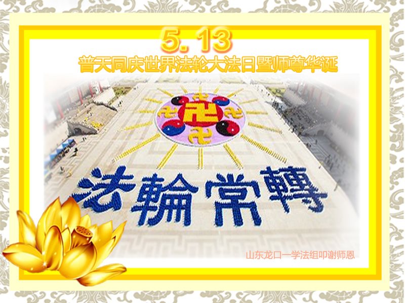 今年的5月13日是师尊的华诞、是师尊洪传宇宙大法、广度众生25周年的纪念日。在弟子的心目中,这是穹苍间最神圣的日子。在此弟子们跪叩师尊!道一声:恭祝师尊生日快乐!您的伟大、慈悲,人类的言语不能表达,您为穹苍无量众生的未来美好辛苦了!这么多年来,是大法让弟子了悟人生真谛,是大法给了弟子正念,在去执着、救人的修炼路上活的坚定、自信、充实。不管今后的路还有多长、多艰险,弟子定努力做好三件事,跟着师尊勇往直前到永远! 山东滨州全体大法弟子恭祝师尊生日快乐!普天同庆世界法轮大法日!