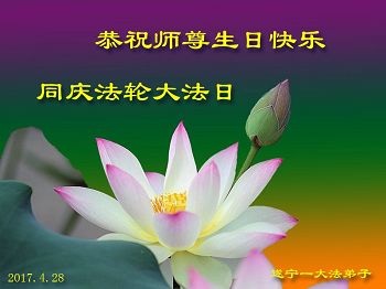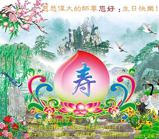 师父好!师父生日快乐!弟子会在今后的日子里,跟上正法進程,力争走正走好每一步,努力学好法,尽快洗净人心,兑现誓约,跟师父回家。 四川省遂宁一大法弟子恭祝师尊生日快乐!同庆世界法轮大法日!