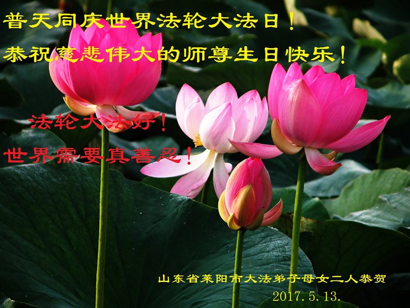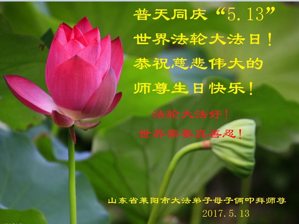【明慧网二零一七年五月八日】 山东省烟台市莱阳市大法弟子母女二人恭祝慈悲伟大的师尊生日快乐!恭贺“5.13”世界法轮大法日!