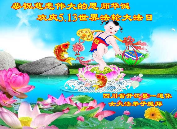 四川省达州市开江县一退休女大法弟子恭祝慈悲伟大的恩师华诞!欢庆5.13世界法轮大法日!