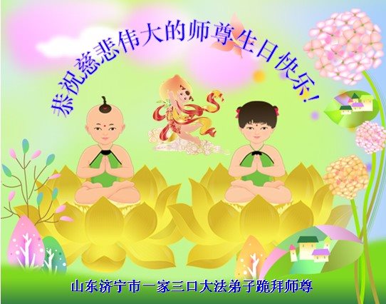 山东济宁一家三口大法弟子恭祝慈悲伟大的师尊生日快乐!