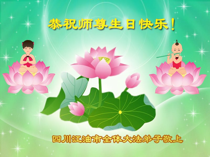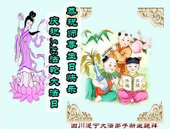 尊敬的师父:您好! 在这双庆的日子里,弟子感恩的心在跳动,思念的泪水湿满双眼,是您含辛茹苦带着我们走过了岁岁月月时时刻刻看护着我们,保护着我们。师父啊!我们用尽人间语言也写不完师尊的洪恩浩荡,是您把我从地狱捞起,带领我修炼,给我净化心灵,净化身体,成为一个真正的修炼人,师恩难忘啊,终身难报。在最后的日子里,我唯有精進再精進!修好自己,做好三件事,救度众生,圆满随师返! 跪拜师尊! 四川遂宁大法弟子新生跪拜 二零一七年四月二十九日 四川遂宁南莲学法组全体大法弟子恭祝师尊华诞暨5.13世界法轮大法日!