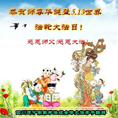 祝贺全世界大法弟子“五·一三”法轮大法日快乐!普天同庆! 我们一定能做好三件事,救度更多的众生,不辜负师尊的慈悲苦度,圆满随师还! 四川省南部县全体大法弟子跪敬 大陆大法弟子祝师父生日快乐!