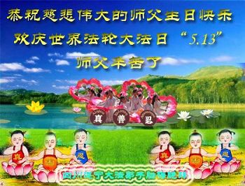 师父的恩德,弟子无以言表,将谨遵师父的教诲,努力做好三件事,谢谢师父! 烟台学法小组 大陆大法弟子一家人拜问慈悲伟大的师父生日快乐!并恭贺世界法轮大法日!