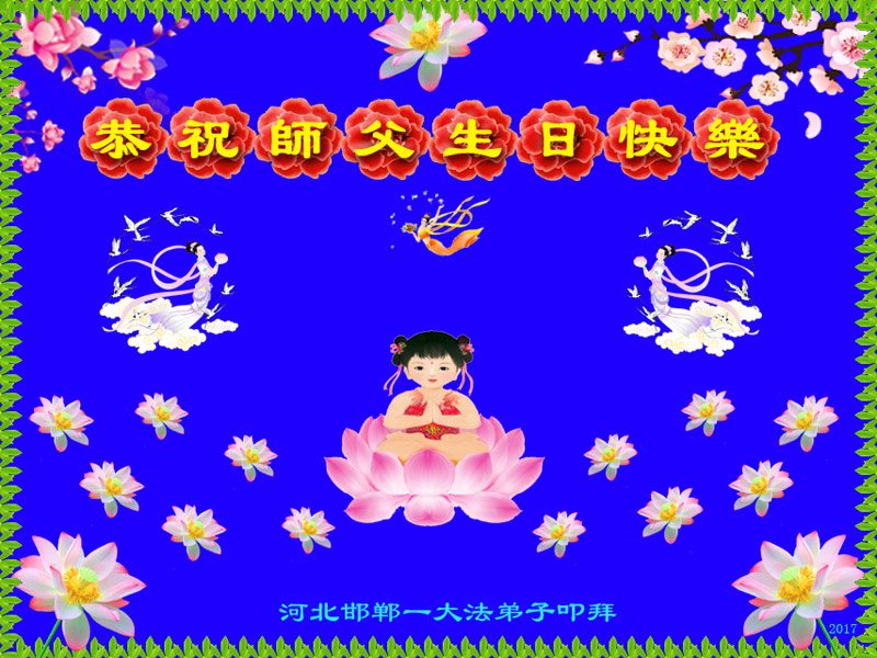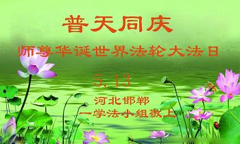 【明慧网二零一七年五月八日】 河北邯郸一学法小组大法弟子普天同庆师尊华诞暨世界法轮大法日!