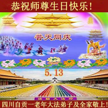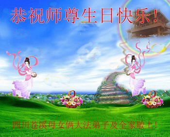 感恩师尊慈悲度 万魔难阻回天路 助师正法兑誓约 众生得救恶龙除 喜迎今日五一三 含泪叩拜谢师父 修心去执要如初 圆满随师了宏图 四川苍溪母女俩大法弟子及全家恭祝慈悲伟大的师尊生日快乐!