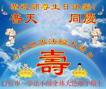 师父您好!您辛苦了!我们唯有听师父的话,抓紧时间学法,去执着,多救人,做好三件事,跟上正法進程,完成我们的历史使命,兑现神圣的誓约,跟着师父圆满把家还。叩拜师尊!合十 四川自贡一老年大法弟子及全家恭祝慈悲伟大的师尊生日快乐!