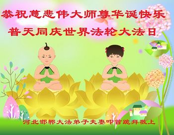 慈悲伟大的师父您好!“五·一三”即将来临,在这普天同庆的神圣节日里,弟子感恩师父!感恩师父的慈悲保护与救度!弟子为慈悲的师父送上最衷心的祝愿:师父生日快乐!谢谢师父!弟子紧跟师父的正法進程,听师父的话,做好三件事,多学法,遇事向内找,修好自己,多救人,兑现誓约,跟随师父返回真正的家园。 河北邯郸夫妻大法弟子恭祝慈悲伟大的师尊生日快乐!