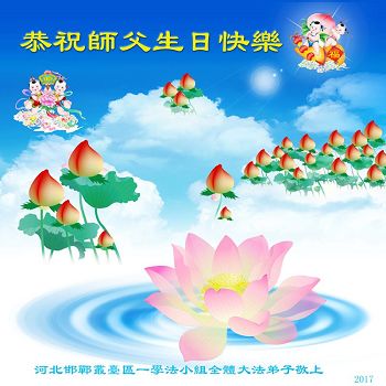 【明慧网二零一七年五月八日】 河北邯郸丛台区一学法小组全体大法弟子恭祝慈悲伟大的师父生日快乐!
