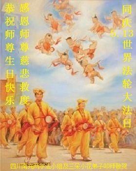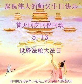 在这普天同庆师尊华诞和大法洪传世间二十五周年之际,我们夫妻同修向慈悲伟大的师尊叩首跪拜,感恩师尊的慈悲救度!师尊给予弟子的一切无法用语言言表,弟子唯有做到信师信法真修实修勇猛精進比学比修做好三件事不辜负师尊的慈悲苦度圆满跟随师尊回家。唯愿师尊笑! 四川仁寿大法弟子庆祝5·13世界法轮大法日暨师尊生日快乐!