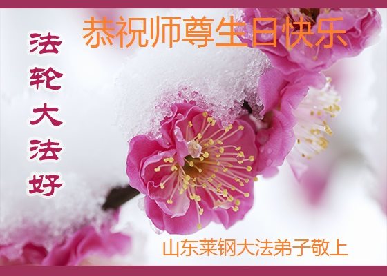 山东莱钢大法弟子恭祝慈悲伟大的师尊生日快乐!恭贺世界法轮大法日!恭贺法轮大法洪传二十五周年!