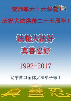 师尊您好!您辛苦了!在正法的最后阶段,弟子唯有听师父的话,以法为师,做好三件事,精進实修,多救人,兑现史前大愿,圆满随师还。跪拜师尊! 辽宁营口大法弟子贺大法洪传二十五周年!贺师尊六十六华诞!