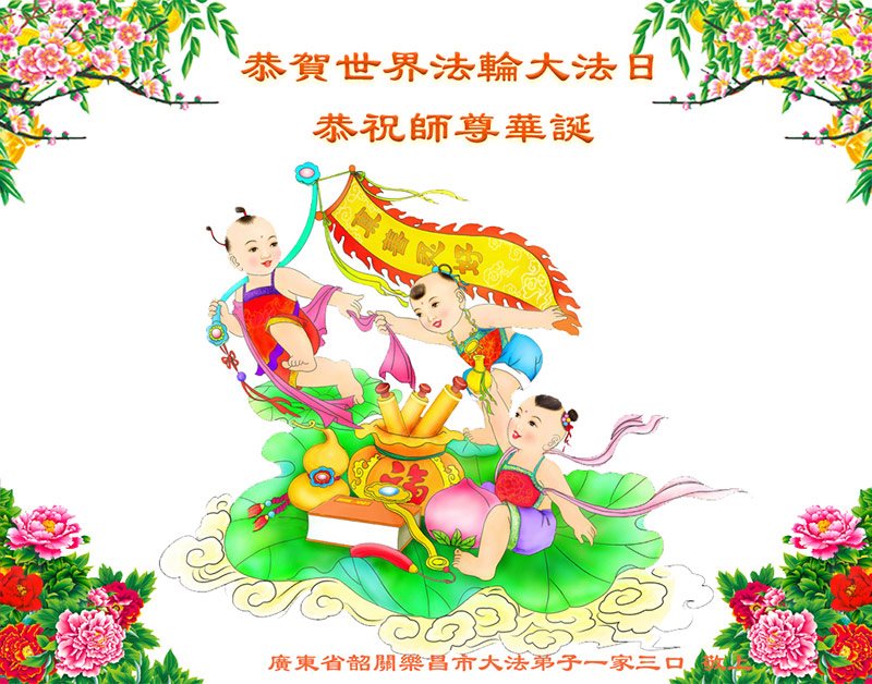 师尊好!师尊辛苦了!弟子正在努力去执着,不断在法中精進,同化真、善、忍,跟随师尊同回天宇。 广东韶关乐昌大法弟子一家三口恭祝师尊华诞!恭贺世界法轮大法日!