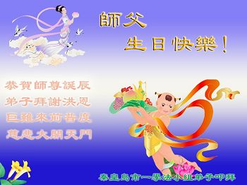 师尊辛苦了!我们一定听师父的话,做好三件事,学好法,多救人,兑现自己的史前大愿,不辜负师父的慈悲苦度,跟师父回家。请师父放心! 河北省秦皇岛青龙县大巫岚镇大法弟子恭祝师尊生日快乐!同贺世界法轮大法日!