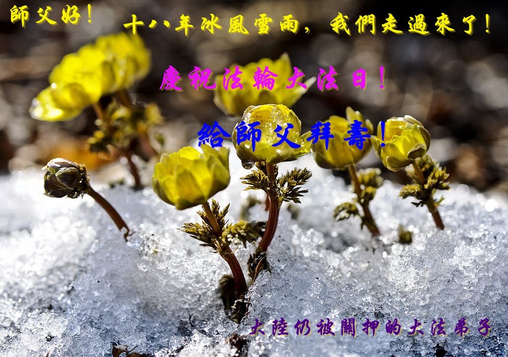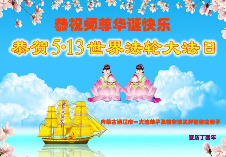 弟子无论在哪里都不会放弃对大法的信仰,不会停下追随师父的脚步。 十八年来风雨摧,傲雪春梅姿更翠。 法徒难中心有法,坚定正念志不退。 今生得法永不悔,只愿随师把家回。 又逢此刻欢庆日,万古新宇放光辉。 内蒙古通辽市一大法弟子及被非法关押迫害的妻子恭祝师尊华诞快乐!恭贺全世界法轮大法日!