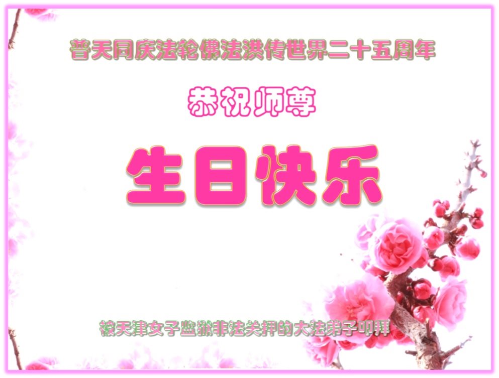 被天津滨海监狱非法关押的大法弟子在法轮佛法洪传世界二十五周年之际,叩拜恩师!红墙铁铐消不弱弟子同化“真、善、忍”宇宙特性的坚强意志,关不住返本归真的善心真念,在法轮大法日弟子们恭祝师父生日快乐! 人生茫茫苦与累,灯红酒绿惹人醉。 红尘乱象迷住眼,仰天长叹我是谁。 大法开传似惊雷,法力无边唤回归。 幸遇师尊慈悲度,精進实修不迷途。 邪恶之徒心不轨,迫害好人犯大罪。 随师正法救世人,众生觉醒把党退。 雪地梅花不畏寒,历尽风雪姿韵翠。 十八年来又逢春,法徒同贺拜师恩。 被天津女子监狱非法关押的大法弟子恭祝师父华诞快乐!
