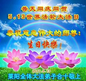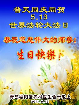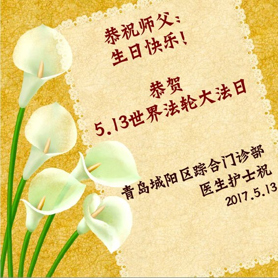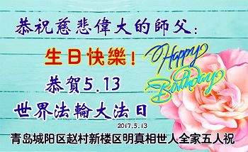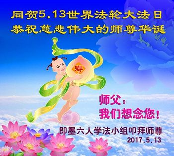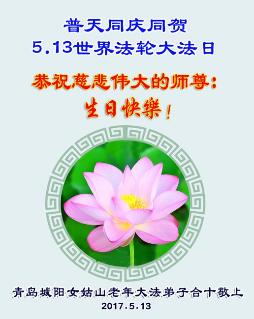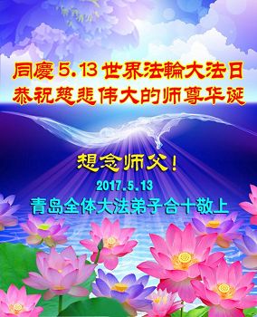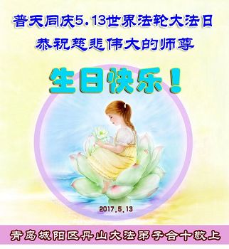 【明慧网二零一七年五月九日】 山东省青岛市即墨市6人学法小组大法弟子恭祝慈悲伟大的师尊生日快乐!同贺世界法轮大法日!