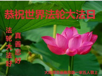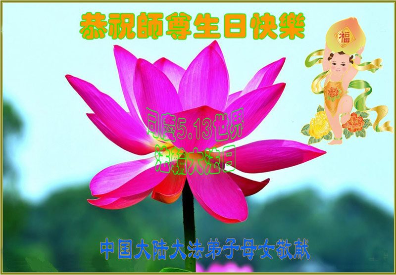 值此世界法轮大法日到来之际,恭祝师尊生日快乐!衷心感谢慈悲伟大的师尊!并向师尊叩拜!弟子非常想念师尊,并认真做好三件事,走好最后的路!弟子合十! 中国大陆大法弟子母女恭祝师尊生日快乐!同庆世界法轮大法日!