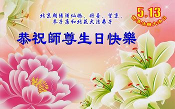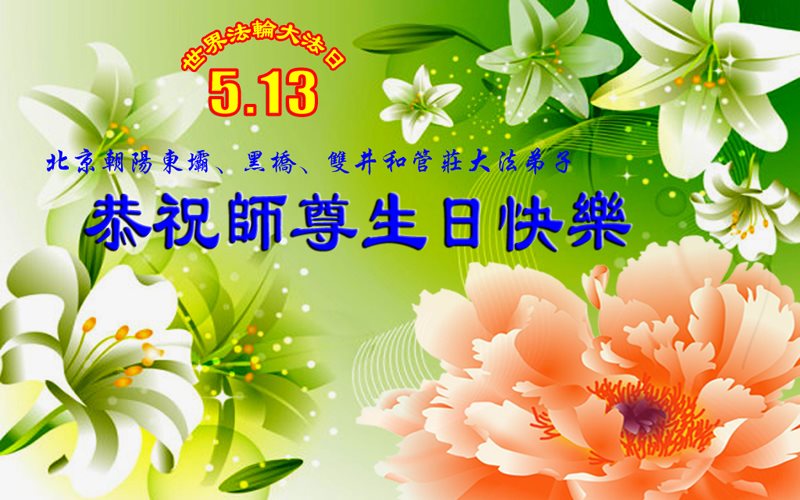 值此世界法轮大法日到来之际,恭祝师尊生日快乐!并向师尊叩拜!大法弟子非常想念师尊,衷心感谢慈悲伟大的师尊!我们会按师尊的教诲,走好最后的路!弟子合十! 北京朝阳东坝、黑桥、双井和管庄地区大法弟子恭祝师尊生日快乐!庆贺世界法轮大法日!