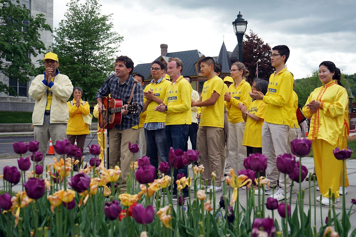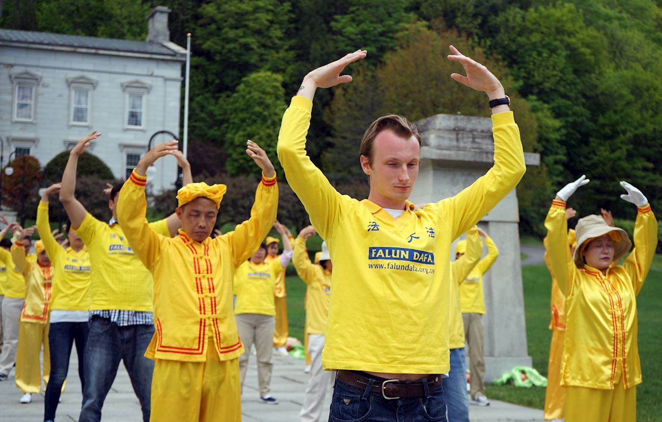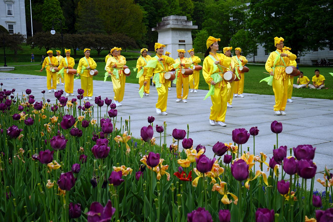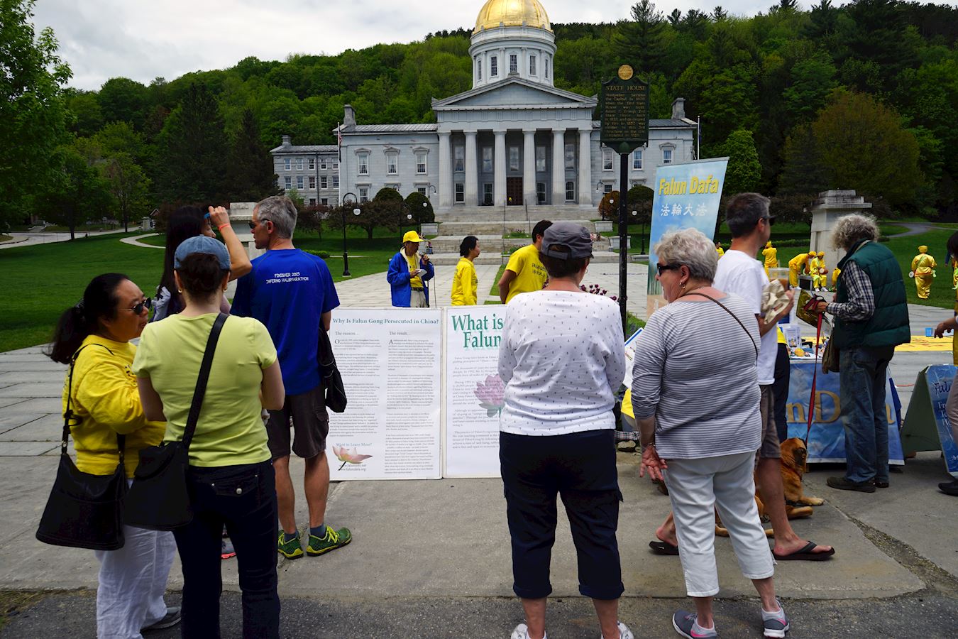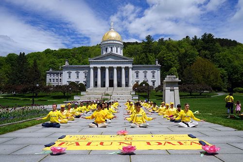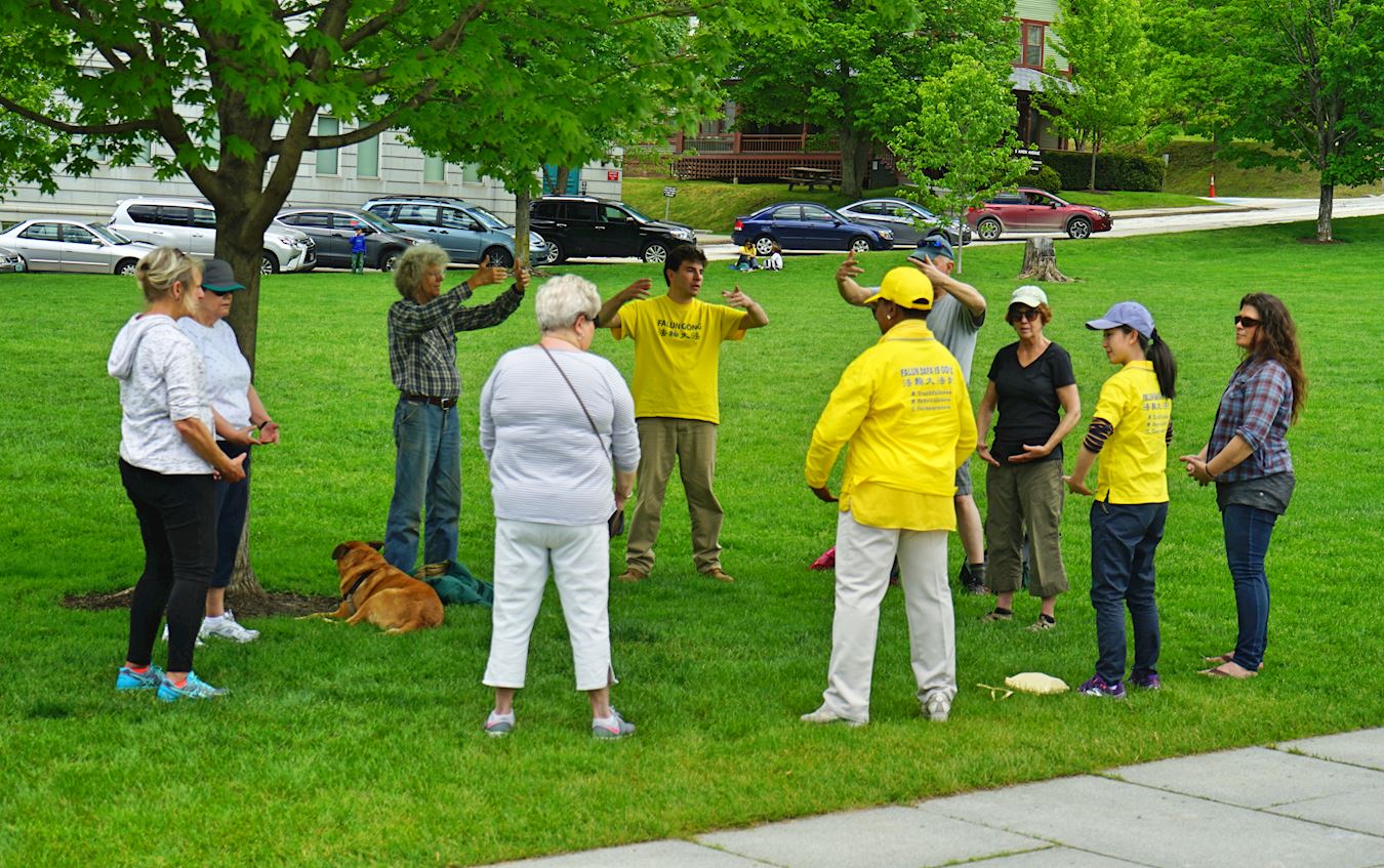 【明慧网二零一七年六月一日】二零一七年五月二十七日,来自美国和加拿大的部份法轮功学员在美国佛蒙特州政府前举办欢庆“世界法轮大法日”活动。当天,学员们以集体炼功、腰鼓歌唱表演、展示真相展板等形式向当地民众展示法轮功的美好,传播法轮功的真相。 图1~2:二零一七年五月二十七日,部份来自美国和加拿大的部份法轮大法学员在美国佛蒙特州政府前举办欢庆“世界法轮大法日”活动。图为法轮大法学员们集会炼功,展现法轮大法的美好。 |