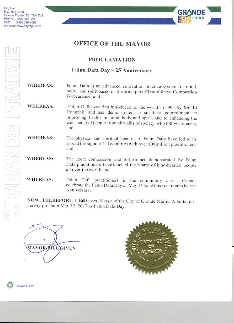 | 【明慧网二零一七年六月一日】二零一七年五月,加拿大阿伯塔省(Alberta)大草原市(Grande Prairie)市长和国会议员克里斯·沃肯庭,省议员韦恩·赖斯戴尔和省议员托德·罗文颁发褒奖状或贺信,褒奖法轮功以及“真善忍”价值。 大草原市市长褒奖 大草原市(Grande Prairie)市长宣布五月十三日为“法轮大法日”。以下是市长比尔·吉温(Bill Given)发出的褒奖译文: 市长办公室 褒奖 法轮大法日 - 25周年 鉴于,法轮大法是一个基于真、善、忍原则的高层次身心和精神修炼体系; 鉴于,法轮大法由李洪志先生于1992年首次传与世人;不断的给各行各业的修炼者带来身心与精神的健康; 鉴于,法轮大法使人身心受益,因而传播到世界100多个国家,有超过一亿人修炼; 鉴于,法轮大法学员所展示的伟大的善和忍感动了全世界的好心人; 鉴于,加拿大社区的法轮大法修炼者们于5月13日欢庆法轮大法日和法轮大法洪传25周年。 我,比尔·吉温,阿伯塔省大草原市市长,在此宣布2017年5月13日为法轮大法日。 签名 比尔·吉温 大草原市市长  图1:市长比尔·吉温(Bill Given)发出的褒奖 |