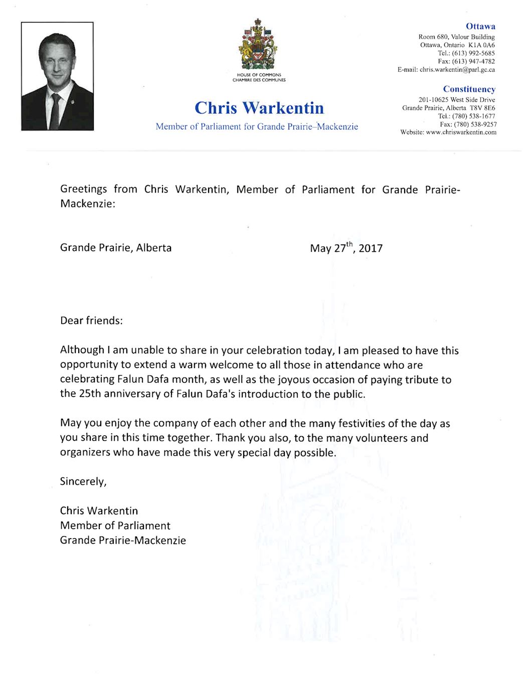 大草原市国会议员克里斯·沃肯庭贺信 大草原市国会议员克里斯·沃肯庭为法轮大法洪传25周年发来贺信。以下为全文译文: 阿伯塔省大草原市 2017年5月27日 亲爱的朋友, 虽然今天我无法参加你们的庆祝活动,但我很高兴有机会向所有参加庆祝法轮大法月人士致以热烈的欢迎,并向法轮大法洪传25 周年致敬。 希望你们享受彼此以及你们一起参与的许多庆祝活动。也感谢你们,众多的志愿者和组织者们,使得这样特殊的日子得以实现。 诚挚的, 克里斯·沃肯庭 国会议员 大草原市-麦肯齐  图2:大草原市国会议员克里斯·沃肯庭为法轮大法洪传25周年发来贺信 |
