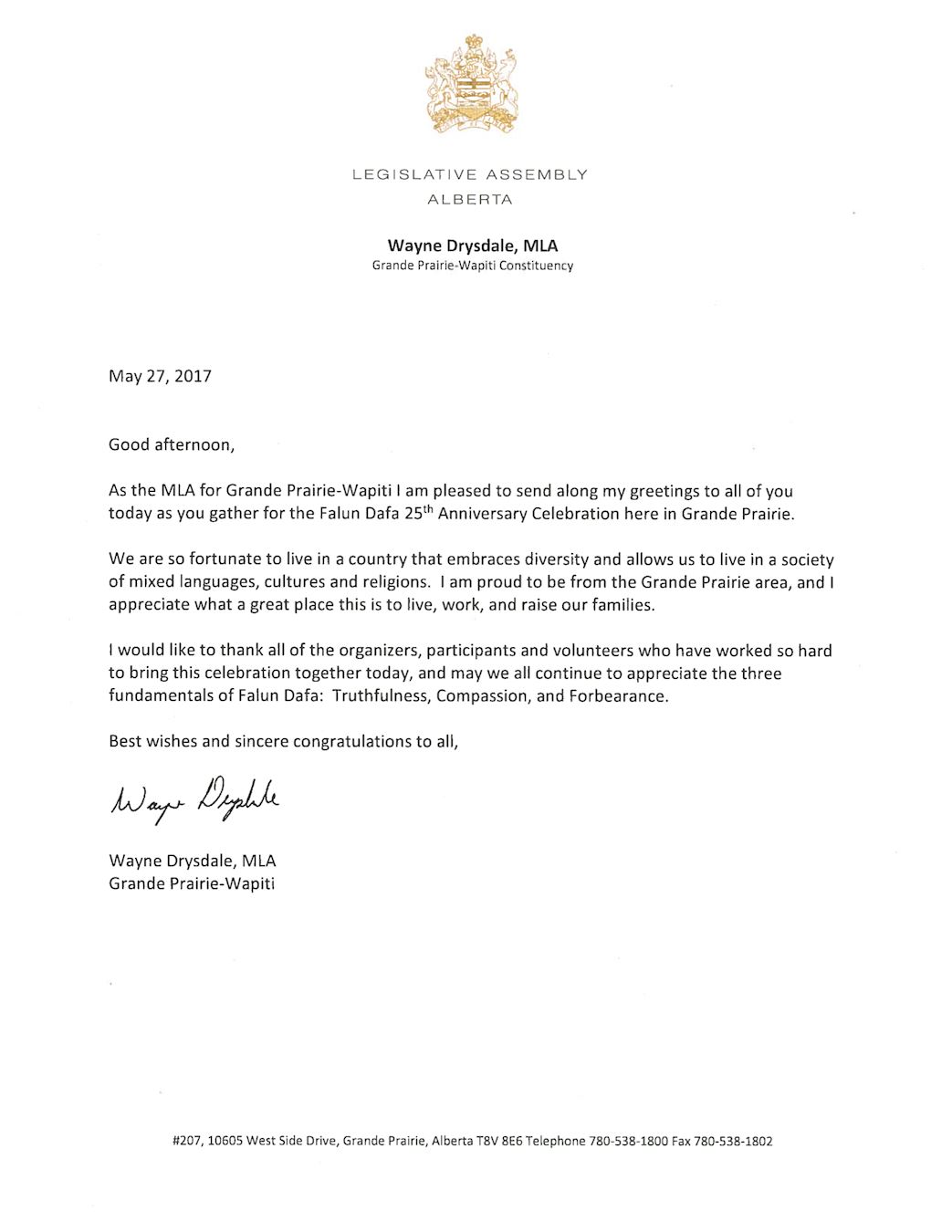 大草原市省议员韦恩·赖斯戴尔发来贺信 大草原市省议员韦恩·赖斯戴尔发来贺信,译文如下: 2017年5月27日 下午好, 作为大草原-麋鹿区的省议员,我今天很高兴向在大草原庆祝法轮大法弘传25周年的各位致以问候。 我非常幸运地生活在拥抱多样性的国家,使我们能够生活在一个拥有各种语言、文化和宗教的社会中。我很自豪能够生活在大草原地区,一个生活、工作和扶养家庭的好地方,为此,我十分感激。 感谢所有的组织者、参与者和志愿者,你们的辛苦努力使得今天的共同庆祝得以实现,希望我们都继续欣赏法轮大法的基本原则:真、善、忍。 祝福并真诚祝贺大家, 韦恩·赖斯戴尔,省议员 大草原-麋鹿区  图3:大草原市省议员韦恩·赖斯戴尔发来贺信 |