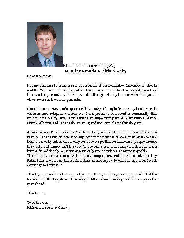 大草原市省议员托德·罗文发来贺信 大草原市省议员托德·罗文发来贺信,译文如下: 我很高兴代表阿伯塔省立法会和野玫瑰官方反对党致以问候。很遗憾我无法亲自参加这个活动,但是我期待在未来的几个月的其他活动中有机会跟大家见面。 加拿大是一个由丰富背景、文化、和宗教经历的人组成的一个多元国家。我自豪地代表一个体现这种特征的社区,而法轮大法是使大草原、阿伯塔、和加拿大成为这样一个美好而具包容性的地方的一个重要组成部份。 如你所知,2017年是加拿大的150岁生日,而几乎在其整个历史上,加拿大经历了前所未有的和平与繁荣。虽然我们真的被祝福才会如此,但我们很容易忘记,对于世界上数以百万计的人来说却并非如此。那些在中国和平修炼法轮大法的人们,在过去的差不多二十几年中遭受了致命的迫害。这是不能接受的。 法轮大法提出的真、善、忍的基本价值观是所有加拿大人渴望体现的,也是我每天努力去代表的。 再次感谢你们让我有机会代表阿伯塔省立法会的议员向你们致以问候,也祝你们今后充满祝福。 谢谢你们, 托德·罗文 大草原-烟雾区省议员  图4:大草原市省议员托德·罗文发来贺信 |