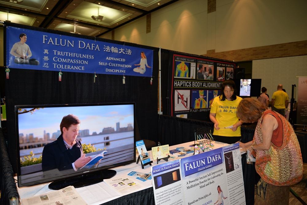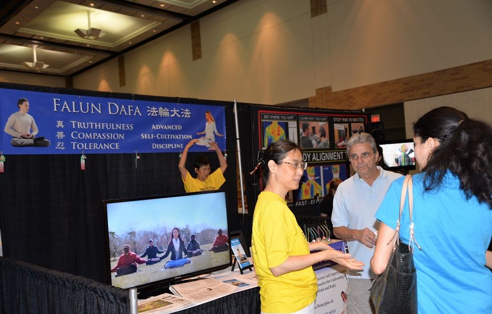 【明慧网二零一七年六月二十九日】二零一七年六月二十五日星期日,在美国德克萨斯州布兰诺市会议中心(Plano Convention Ceter)举办的“生活与健康大全”上(Holistic Festival of Life and Wellness),许多来此寻找精神、健康提升方面的人们在这里喜遇法轮功。苏珊女士告诉法轮功学员:她以前就知道法轮功,今天遇到你们,非常高兴,想着带她母亲一起学习法轮功。 图1:达拉斯法轮功学员在“生活与健康大全”上介绍法轮功 |