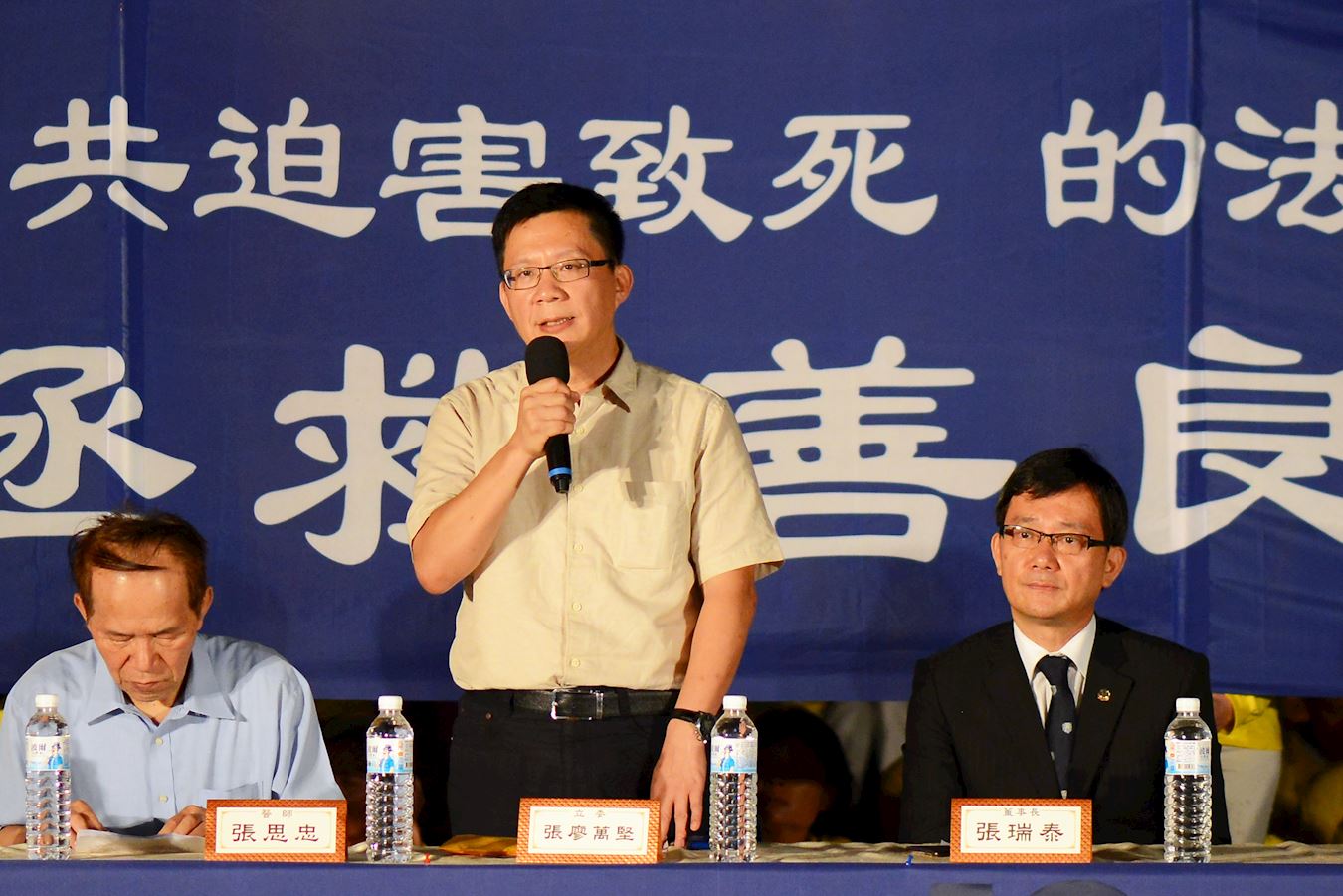 立法委员张廖万坚表示:“法轮功是鼓励人们修炼,自我提升,非常好的团体。”但他看到十八年来法轮功遭到中共非常残暴的对待,“真是怵目惊心”。然而法轮功学员没有被迫害倒,他在世界各地看到学员不断地向国际社会提出控诉,在台湾各地也能看到学员反迫害的活动,令他很佩服。 张廖万坚认为,应该要让台湾民众知道,“如果中共不放弃这样残暴、迫害人权的行为,就必须要跟他们保持距离,必须要对他们的作为谴责。” 张廖万坚鼓励法轮功学员继续坚持反迫害,他相信“终将会看到(中共)这个政权垮台。它会因为它的畏惧,因为它的仇恨,因为它统治的不正当性,它统治的不正义,它统治的残暴,会受到人民的推翻。”  图6:台中市议员杨典忠相信法轮功学员锲而不舍地反迫害,一定会改变中国社会。 |