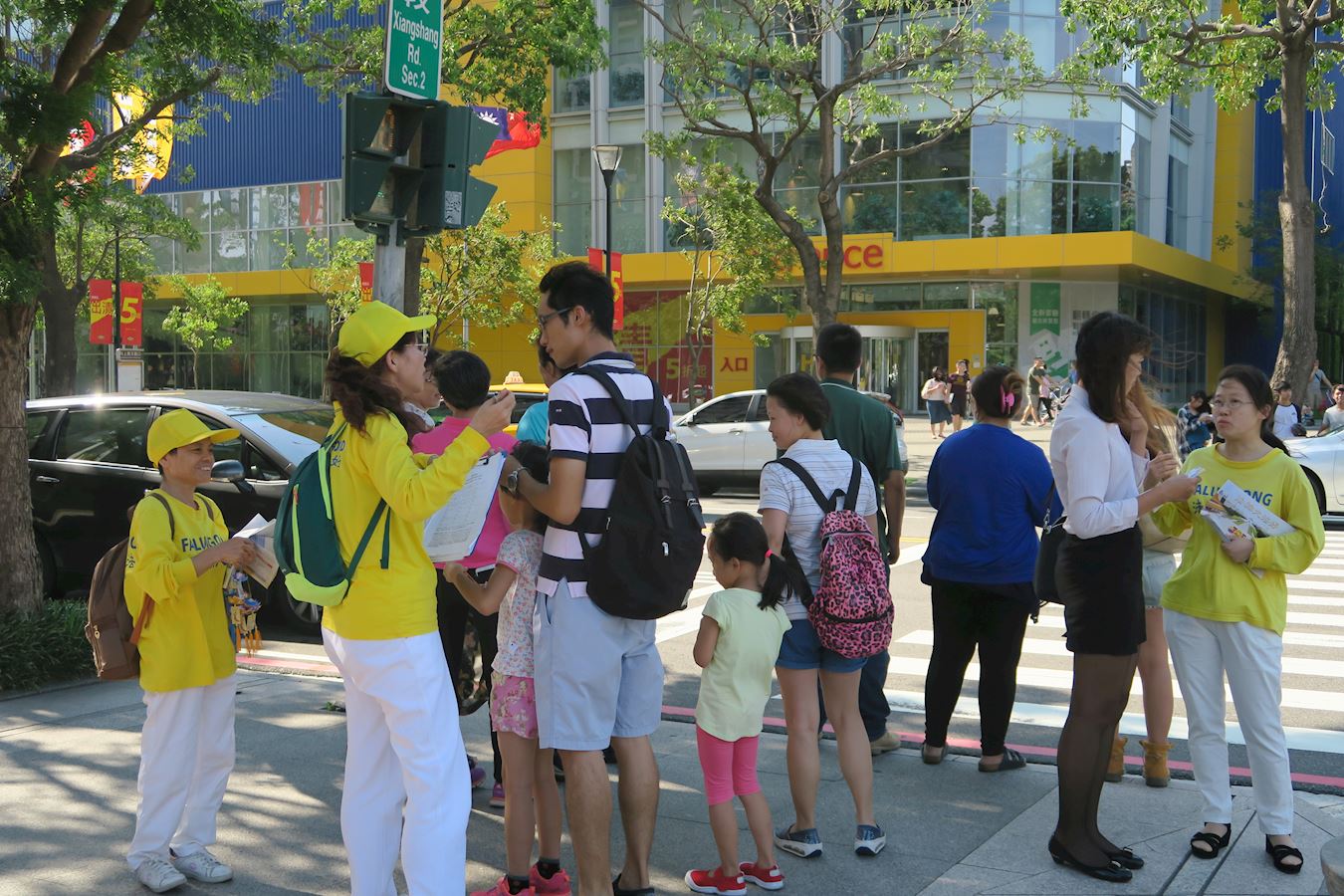 致力于追求自由平等的人民团体台湾中社常务监事张思忠医师表示,“法轮功修真善忍,一定是好的修炼,不应该受到迫害。”他从历史的经验来看,“历史上很多迫害宗教、迫害人民的政府,早晚都会倒。”所以他要求共产党停止迫害法轮功,台湾政府更应该帮助制止迫害。 张思忠表示,江泽民迫害法轮功是伤天害理的事,他从媒体看到现在有很多人控告江泽民,他认为“每个人都应该关心(迫害)这件事,因为今天不关心,明天就会轮到我们身上。” 他呼吁台湾民众“要支持法轮功反迫害、反活摘器官。我们要团结起来,善的力量才能强大,才能打倒邪恶的力量,终止这场迫害人民、活摘器官的恶行。”他同时呼吁中国人要争取自由平等,“要勇敢地站出来,中国才会改变,我们的子孙才会得到自由平等。” 了解真相民众声援 集会会场位于台中市交通流量很大的向上路二段上,对面又有大商场,数面大横幅上停止迫害的诉求,吸引过往民众的目光。有路过的民众为同伴解释:“法轮功在大陆被迫害。”有机车骑士大声呼喊:“停止迫害!”为学员加油。 经过这儿的陈先生,远远走来即高喊:“法轮大法好!”学员上前向他征签声援大陆民众控告江泽民,他二话不说即签上姓名,离开时又喊了几声“法轮大法好!”  图8:法轮功学员在集会场附近派发资料,向民众讲真相,征集联署声援诉江。 |