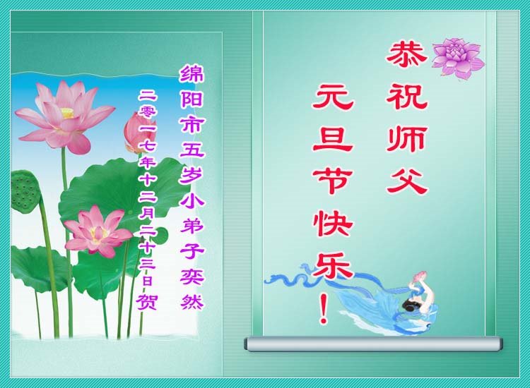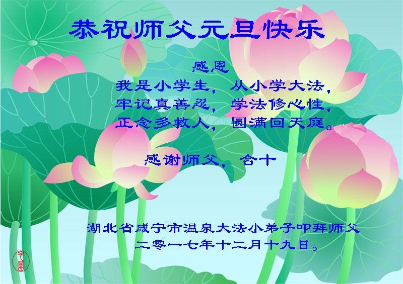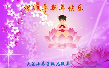| 【明慧网二零一八年一月一日】新年到,大陆大法小弟子给远在海外的师父发送和贺信。大法小弟子告诉师父,他们会多学法,好好修,他们想念师父,祝师父天天快乐! 有的大法小弟子告诉师父自己也在学法救人,但由于自己爱玩的心很重,以后一定要改。 有个大法小弟子感谢师父对她的保护,让她在一个清新的环境下成长,懂得做人的道理。 一个大法小弟子对师父说:“祝师父快乐!新年好,天天好,多谢师父,我一定好好学法,不会辜负您的希望!” 大陆大法小弟子祝师尊新年快乐!师尊您好,您辛苦了! 我是一名大法弟子的孩子,在新年来临之际我祝师尊新年快乐! 感谢师尊的保护,使得我在人生道路上遇到了学大法的一家人,从小他们就给我讲修炼的故事,教我背《论语》,每天让我听大法的音乐,教导我按真善忍做一个好人。渐渐的我长成了大姑娘,在学校他们说我正直善良、品学兼优。我想这是师尊您在帮助我啊,谢谢师尊,师尊辛苦了。 作为大法弟子家的孩子就是和普通孩子不一样。在家人遭受迫害被关押的时候,我镇定地保护他们,自己也得到了锤炼。请师尊放心,我是大法小弟子,我要改掉坏毛病不断進步。 大法小弟子敬上 张北县大法小弟子恭祝师父元旦快乐!大法小弟子用创意泥创作的小作品恭祝师父元旦快乐!表达大法小弟子对师父的感恩。谢谢师父的慈悲保护!叩拜师尊! 山东平原一大法弟子和家中两名大法小弟子敬祝恩师新年快乐!无论正法还有多长时间,弟子一定跟师父坚修到底! 师恩难报,唯有精進,叩谢师恩! 山东省平原县大法弟子 黑龙江省勃利县大法小弟子恭祝慈悲伟大的师尊新年快乐!黑龙江省勃利县大法小弟子问候师尊,恭祝师父新年快乐! 黑龙江省勃利县大法小弟子敬上 河北邢台大法小弟子恭祝师尊元旦快乐!弟子祝慈悲伟大的师父元旦快乐!感谢师父慈悲救度。我每次节日都想给师父画一张,我还想给师父写字呢。在新的一年里,我要好好修心。 上海八岁大法小弟子和父母同修恭祝师尊新年快乐!谢谢师父的慈悲保护!叩拜师尊! 江苏淮安全体大法小弟子恭祝师尊元旦快乐!感谢师尊救度之恩! 江苏淮安全体大法小弟子跪拜 黑龙江省大兴安岭塔河县大法小弟子恭祝师尊新年快乐!祝师父新年快乐!谢谢师父的慈悲苦度! 黑龙江省大兴安岭塔河大法小弟子跪拜师尊 山东招远市一大法小弟子和两个小弟弟问师父新年好!大法小弟子盼师父快回来吧!大法小弟子们想念师父! 天津全体大法小弟子遥拜师尊新年快乐!大法小弟子也要多学法,发好正念,证实法,好好修,跟师父回家! 四川一大法小弟子恭祝慈悲伟大的师尊新年快乐!慈悲伟大的师尊您辛苦了!小弟子想念师尊!新年到了,大陆大法小弟子向慈悲伟大的师尊拜年。恭祝师尊新年快乐!大法小弟子跪谢师尊的慈悲救度!感谢师尊时时刻刻慈悲呵护我们,使我们在大法中不断成长升华。 谢谢师尊!谢谢师尊! 四川自贡一大法小弟子及全家向慈悲伟大的师尊跪拜! 四川省绵阳市五岁大法小弟子奕然恭祝师父元旦节快乐!大陆一大法小弟子恭祝师父新年快乐!谢谢您这么多年对我的保护,让我在一个清新的环境下成长,懂得做人的道理。但我现在陷入了一个艰难的境地,希望您能给予我帮助,让我早日走出困境。 再次感谢您! 小弟子敬上 大陆大法小弟子恭祝师尊新年快乐!祝师父快乐!、新年好,天天好、多谢师父,我一定好好学法,不会辜负您的希望! 大陆大法小弟子恭祝师父新年快乐!新年来临,小弟子向师父问好,师父新年好! 师父虽然给我打开了天目,知道了大法的美好。在学法上我学的不好,爱玩的心很重,没有真正的了解大法,讲真相不会讲。在学校时跟几个小同学讲真相,讲大法美好,讲共产党残害好人,退出邪*党-组织,三:退.保平安。有一位同学当时就退出了邪*党-少先队组织。我心里特别的高兴,他得救了。 我以后要认真的学法,去掉爱玩的一切执著心。多救人,不辜负师父对我的期望。 大陆大法小弟子敬上 山东青岛市全体大法小弟子恭祝慈悲伟大的师尊新年快乐!我们是青岛大法小弟子,要修好自己,兑现誓约,跟师父回家! 青岛市全体大法小弟子敬拜 黑龙江省哈尔滨大法小弟子恭贺慈悲伟大的师尊新年快乐!黑龙江省五常市拉林镇一大法小弟子恭祝师尊新年好!小弟子谢师恩 小弟子虔诚心 新年临敬师尊 三拜九叩谢师恩 真善忍印在心 过关中有师尊 幸福快乐!沐洪恩 湖北省咸宁市温泉大法小弟子恭祝师父元旦快乐!感恩 我是小学生,从小学大法; 牢记真善忍,学法修心性; 正念多救人,圆满回天庭。 感谢师父,合十。 咸宁市温泉大法小弟子叩拜师父 河北省秦皇岛市青龙县全体大法小弟子恭祝慈悲伟大的师尊新年快乐!在2018年快要到来的时候,我们河北省秦皇岛市青龙县全体大法小弟子恭祝慈悲伟大的师尊新年快乐!师父您好,您辛苦了! 我们非常高兴和自豪能成为一名正法时期的大法小弟子!我们要听师父的话,修好自己。当一个家长的好孩子、老师的好学生、师尊的好弟子。做好三件事,跟师父回家。 河北省秦皇岛市青龙县全体大法小弟子跪拜师尊 合十 2017年12月20日 黑龙江省建三江前進农场大法小弟子恭祝伟大师尊新年快乐!弟子感恩师尊普度众生,我也要返本归真,弟子现在要磨炼自己的心性,同化宇宙特性。 黑龙江省建三江前進农场大法小弟子敬上 二零一七年十二月二十五日 大连大