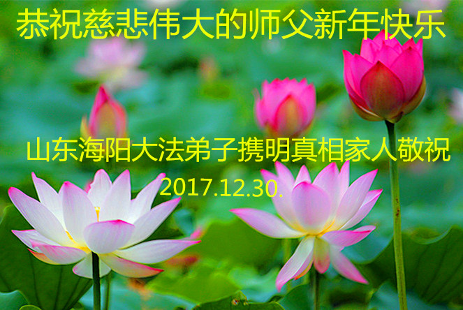 弟子们无法感恩师父为大法弟子们所做的一切!新年将至,弟子们恭祝慈悲伟大的师父新年好。 大陆三口之家大法弟子 二零一七年十二月三十日 山东全体大法弟子恭祝慈悲伟大的师尊新年快乐!感恩师尊慈悲救度!