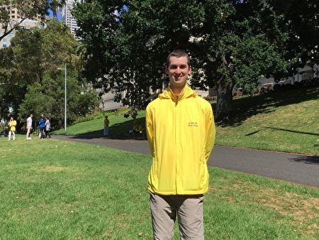 Barbara Shafer是一名画家,14年前她在修复教堂壁画时,从七米高的架子上跌落,险些命丧黄泉。通过朋友介绍修炼法轮功后,她的身体得到奇迹般康复。“我非常非常感谢师父带来了法轮功”,Shafer说。 Shafer说,修炼后她所有方面都得到了提升,更富有同情心、更体贴别人、内心变得更加平和,对师父的感恩之心难以言表。 “今天我们祝师父新年快乐。我对师父的感恩无法用言语表达,只能通过做得更好来表达我的感激之情。法轮功是美好、充满力量的修炼方式,能带给人智慧和提升。”她说。 Shafer想对还不太了解大法的世人说:“法轮大法能够改善社会,挽救人类文明。人们相信法轮功就可以变得更好,就能走入未来。” 生活中实践“真、善、忍”准则  图3:墨尔本法轮功学员Daniel Cameron通过修炼法轮功变得更加快乐。 |