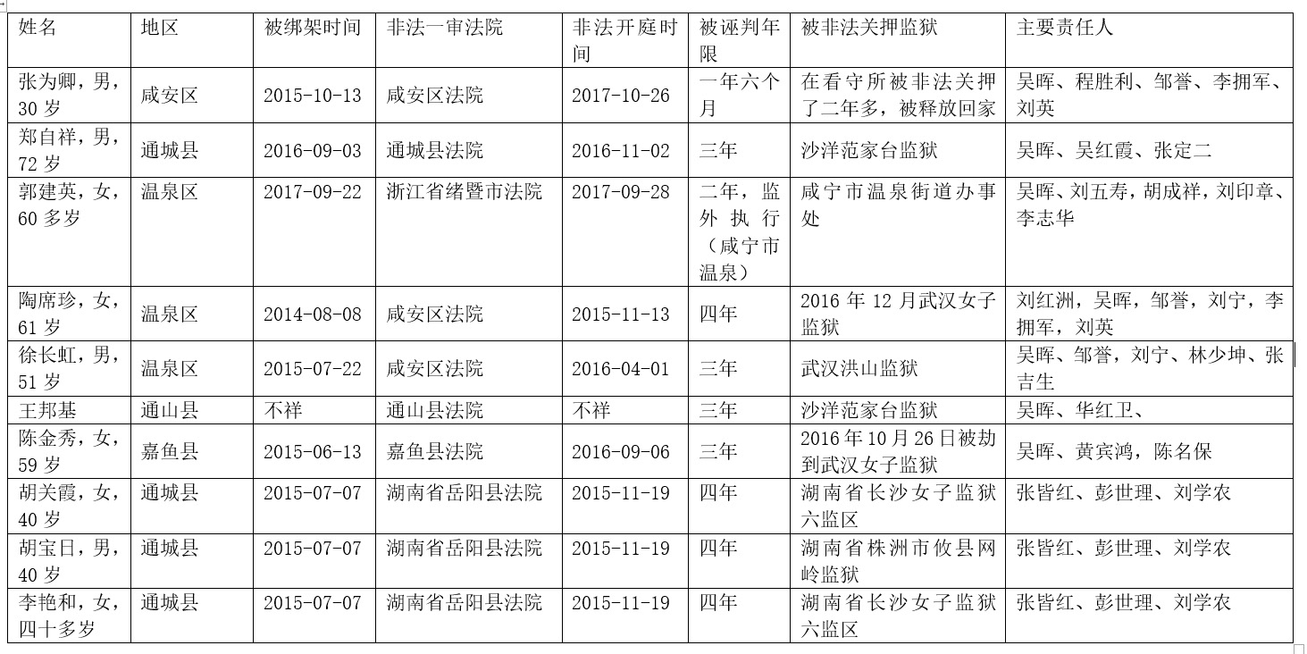 据查,咸宁市副书记吴晖是咸宁市迫害法轮功的幕后指挥者。延续二零一六年四月份在吴晖的组织下,咸宁市为了迫害法轮功,秘密开了几天会,研究如何迫害法轮功的方案,并成立一套班子。他们是:吴晖(市委副书记)、胡甲文(副市长兼公安局长)、聂胜(市公安局副局长)、邹誉(市国保支队长)、姚雄(市六一零头目)、刘宁(原市温泉公安分局国保大队长)、刘颖(原市温泉公安分局政委)、樊忠(咸安区国保大队长)、左水生(原市温泉公安分局副局长)、程胜利(咸安区六一零头目)。二零一七年,在此基础上做了调整,由李宏俊接替刘宁,刘颖退休。尤其是李宏俊、程胜利在这一年的“敲门行动”中最为卖力。二零一七年迫害恶事就是在吴晖这些人的指使下干的。 一、法轮功学员被迫害致死的实例 ◇通城县法轮功学员黎凤保在多个警察围攻下突发脑溢血后离世 黎风保,女,六十五岁,湖北省咸宁市通城县法轮功学员,她的女儿在广东省珠海市做生意。二零一七年,她去帮助女儿带外孙子。九月五日晚十点多,在自己的女儿家中,突然闯入的十几个不明身份的人,未出示任何证件,直冲到每间房拍照搜查,翻箱倒柜,抢走二本大法书和相关资料。见黎凤保在床上睡觉,两个警察进去,把她叫起来,要她拿衣服跟她们到派出所去,她不配合。 在十多个警察的围攻下,老人突然满身大汗淋漓,呕吐,头痛等不适症状。很快衣服湿透了,警察叫她换衣,想绑架走。在换衣服时,发现她的左边肢体不听使唤,她的女儿急忙打电话叫120急救。经检查发现,脑血管破裂,突发脑溢血,需要观察,必要时住院治疗。警察轮流看守着观察了一个晚上,转入住院部住院治疗。十六日复检结果是同样的,出血没停止,医院决定做开颅手术。手术八个小时后才出来。黎凤保一直昏迷不醒,医院告病危。即使成这样,警察仍然轮流看管,不准家属靠近重症病房。家属索要治疗费,涉事派出所拒赔。 当时陪送医院的两个警察,一个姓夏,一个姓陈,他们交待医院叫他们救人,药费派出所出。十七日,警察又去了,说话一样,后来说话一天比一天不一样,意思这是上级安排干的,他们派出所不能出药费。二零一七年十一月,黎风保不幸离世。 二、对法轮功学员非法判刑的实例 二零一六年,咸宁市六一零假借法律之名以《刑法》第三百条对五名法轮功学员第一次非法庭审后,他们都依法上诉了。但是,六一零指使法院仍然冤判,他们是:陈金秀(嘉鱼县,被冤判三年,被投入武汉女子监狱)、郑自祥(通城县,被非法开庭冤判三年,被非法投入范家台监狱)、王邦基(通山县,被冤判三年,范家台监狱)、陶席珍(温泉区,被冤判四年,武汉女子监狱)、徐长虹(温泉区,被冤判三年,武汉洪山监狱分配站)。 二零一六年还有在湖南省被非法判刑的法轮功学员(通城县的胡关霞,四年,湖南省长沙市女子监狱;通城县的胡宝日,四年,湖南省株洲市攸县网岭监狱;通城县的李艳和,四年,湖南省长沙市女子监狱)。 二零一七年,温泉法轮功学员郭建英在浙江省绪暨市法院被诬判三年,监外执行;张为卿在咸宁市咸安区法院被冤判一年六个月,他在看守所被非法关押了二年多,被释放回家。迄今为止,咸宁市还有九名法轮功学员被非法关押在监狱里受折磨。 ◇咸安区的张为卿在看守所被非法关押二年多,被冤判一年六个月,被释放回家 张为卿,男,三十岁,咸安区法轮功学员。二零一五年十月十三日下午,法轮功学员张为卿在温泉谷酒店上班时,七个穿便衣的警察突然闯入他的办公室,在里面强行翻拿私人物品,下午五点左右,这几个人强行将张为卿绑架,并将张为卿的私人物品非法扣押,其中还有一台他办公用的电脑。据有关人士透露,这七个人有咸宁市的警察,也有咸安的警察。张为卿被直接劫持到“湖北省法制教育所”(武汉板桥洗脑班)遭受迫害。二零一五年十二月三十一日被劫持到咸宁市咸安区看守所非法关押。咸安区检察院以“利用网络向海外宣传法轮功”对法轮功学员张为卿下非法逮捕证。二零一七年十月,张为卿被咸安区法院非法判刑一年六个月,十九大后才被释放回家。 ◇药剂师徐长虹控告江泽民,被冤判三年,入范家台监狱 徐长虹,男,五十一岁,是咸宁市中心医院同济咸宁医院中药房药剂师,是单位公认的忠厚善良、工作认真负责的优秀医务工作者。徐长虹信仰法轮功,按真、善、忍理念修炼做好人,却遭受了江泽民集团从一九九九年七二零开始持续至今的十八年来从精神上到身体上的残酷迫害,家中老人、妻子、小孩、众亲戚身心备受煎熬。 二零一五年七月二十二日,在徐长虹写了控告江泽民的诉江状后一个多月,当地六一零(专门迫害法轮功的特务组织)姚雄、国保刘宁等七、八个人再次将上班的徐长虹从医院直接绑架到武汉所谓的“湖北省法制教育所”(板桥洗脑班),进行洗脑迫害。徐长虹在洗脑班被迫害五十二天后,二零一五年九月二日,徐长虹从洗脑班被直接转至咸宁市咸安区看守所非法关押。九月九日,徐长虹被咸宁市中级检察院非法批捕。家人帮助给他聘请了唐天昊律师。 二零一五年十二月一日至二日,徐长虹的家人依法聘请的律师唐天去咸安看守所会见了徐长虹。徐长虹同意唐律师做自己的委托代理人,并签了字按了手印。十二月二十二日下午,唐律师再次去案管中心依法查阅卷宗时,被告知说被解聘了。 二零一六年三月三十一日上午,法院