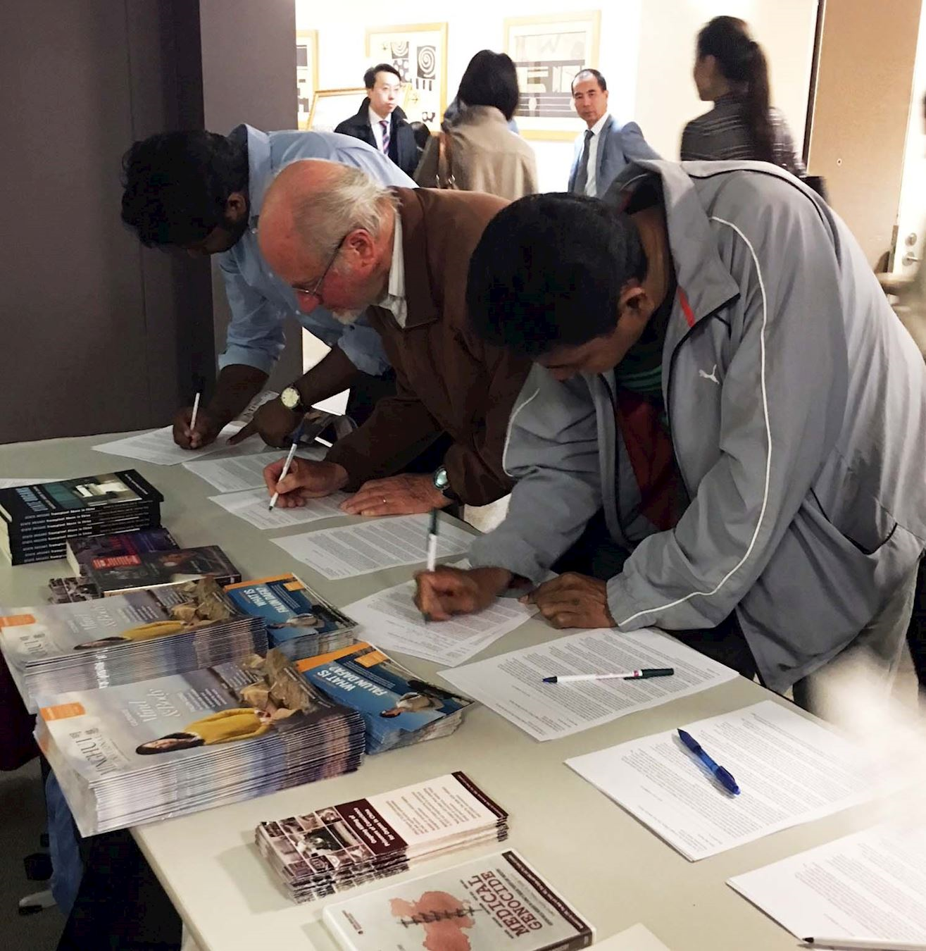 堪培拉一所大学的讲师尼尔(James Neill)博士看完影片后表示非常震惊,尤其是器官移植的数量如此庞大。他说:现在我知道强摘这件事不仅有,而且规模很大,而且是持续性的。我没看多久就明白了,一年十万,这是群体灭绝罪。”  图8:观众在观看《活摘》后,纷纷在制止强摘器官的倡议书上签字 |