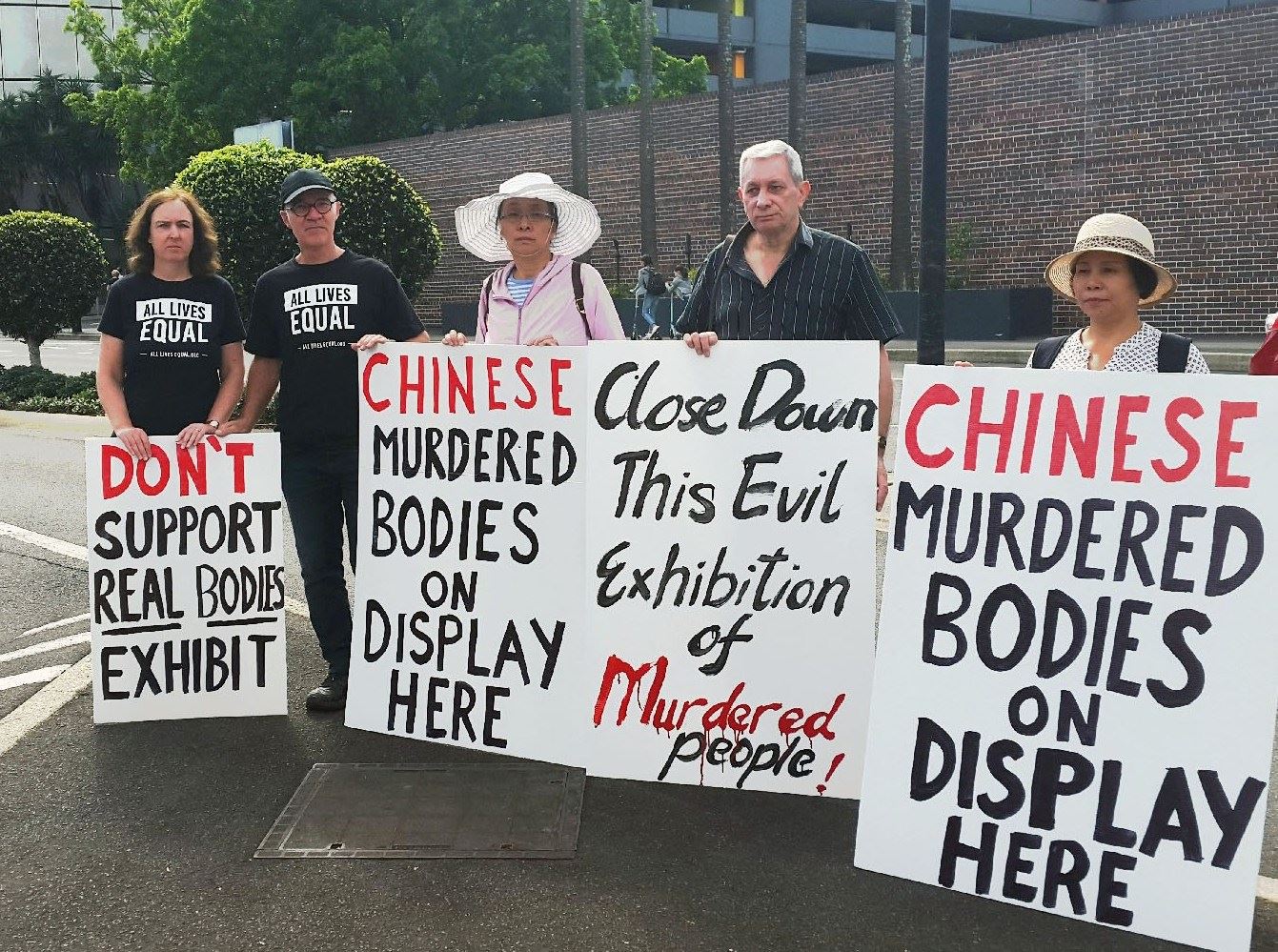 国际著名人权律师、中国移植滥用国际联盟(ETAC)的创始者之一大卫·麦塔斯(David Matas),从加拿大专程赶赴悉尼新闻发布会。他在发言中表示:大卫·乔高(David Kilgour)和我在二零零六年做了这份报告,我们得出的结论是,中国正在杀害良心犯,杀害法轮功学员摘取器官,出售给做器官移植为目的的游客和中国病人。尸体展是又一佐证。器官来源也几乎一样,要么来自警察局、监狱,要么无从所知。我们确认,他们这些尸体来自大量关押良心犯的地方。虽然民众不了解尸体来源是否正当,但是展览机构要展示来源的合理性,但他们不这样做,这就是一个问题。麦塔斯还表示,有令人信服的证据表明:法轮功学员是人体塑化和器官的主要来源。塑化为虐杀无辜者提供了立即的、广泛的、公开可见的现实展现。 澳洲媒体和社会各界关注迫害,抵制“尸体展” 尸体展在悉尼开展不久,即引起澳洲主流媒体、民间机构和各团体的强烈反响,他们普遍表示:这些展示的人体不是自由、自愿捐赠的,法轮功学员被指是最可能的受害者,并要求政府调查并立即关闭尸体展。 澳洲news.com.au、英国《太阳报》、《每日邮报》等都报导了饱受争议的“真人尸体展”使用的标本涉嫌使用良心犯遗体。澳洲传媒news.com.au引述反强摘器官医生组织(DAFOH)发言人布里斯金(Sophia Bryskine)的话表示:“这些人体不是自由、自愿捐赠的,对此表示极度关切”。她表示:“法轮功学员被指是最可能的受害者。” 卫报在二零一八年四月二十四日发表文章“呼吁关闭尸体展,尸体来自死刑犯”;悉尼先驱晨报(SMH) 四月二十五日刊登“呼吁禁止野蛮(crass)尸体展”的报道,一个由律师及悉尼大学学者组成的团体向联邦政府提出关闭尸体展的请求。十二位人权律师联名写信给前澳洲总理马尔科姆·特恩布尔(Malcolm Turnbull)和新南威尔士健康部长布莱德·哈扎德(Brad Hazzard),表达了他们对尸体来源的质疑。该团体表示,有证据显示尸体展的尸体来自中国的死刑犯及政治犯。 澳大利亚BBC在二零一八年四月二十六日报道的文章“尸体在澳洲惹争议”中提到:悉尼大学医学院的Maria Fiatarone Singh教授告诉BBC,这个(尸体制作)机构的驻扎地大连市也引起人们的关注。因为大连是处决被关押法轮功学员的中心要地。 澳洲人权律师协会(ALHR)、新州律师协会(NSW Bar Association)和医学专家、学者及民间社会组织共同联名,向新州州长贝丽吉克莲(Gladys Berejiklian)发出了一封公开信,要求政府立即对悉尼“尸体展”进行调查。信中说:“可靠的证据表明,展览的人体和器官可能来自于被处决的良心犯,其中包括法轮功学员和维吾尔人,这样的人目前在中国关押了超过一百万。” 澳洲社会各界“制止尸体展”  图3:基督徒格雷斯夫妇(左一,左二)自制展板抗议“真人尸体展” |