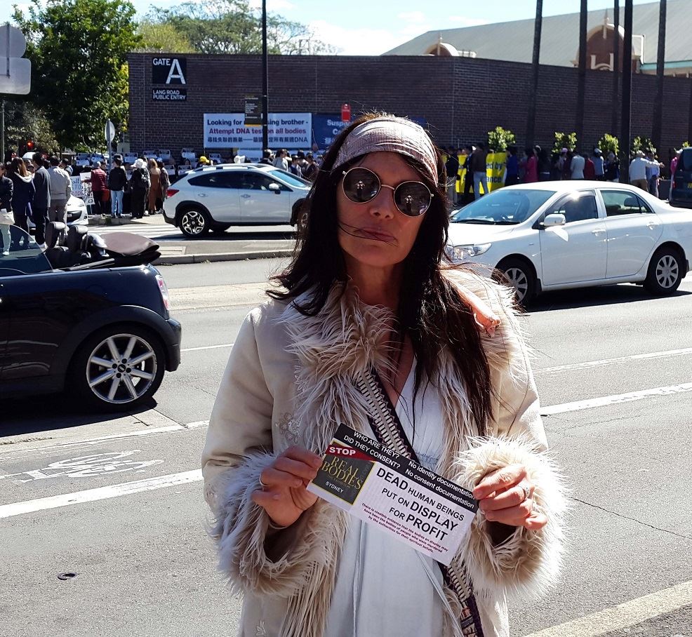 长期坚持在展馆前举牌告诉人们法轮功真相的西人法轮功学员杰夫(Geoff)表示:周围民众的反应非常令人鼓舞,每天都有许多过路行人来了解法轮功真相;还有许多汽车经过时都鸣笛鼓励和支持我们;有的向我们招手示意,还有的竖起大拇指赞扬和支持我们。有一天,一辆355路公共汽车在我面前停下并开门(这不是一个公共汽车站),我以为司机要问情况或拿真相资料,可是司机给我一块巧克力。我说“谢谢你”,司机说:“要谢谢你!谢谢你们每天在这里的努力付出。”全车的乘客都向我们微笑,其中许多人在公共汽车离开时向我们挥手致意。 人权关注者:尸体展让真相越来越多的浮现出来  图5:人权关注者约瑟芬(Josephine Wolansky )表示:尸体展让真相越来越多的浮现出来 |