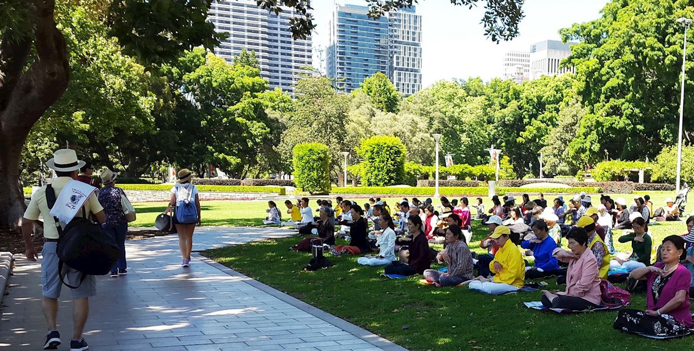 图2:法轮功学员在悉尼市中心的海德公园(Hyde Park)展示法轮功五套炼法。 |