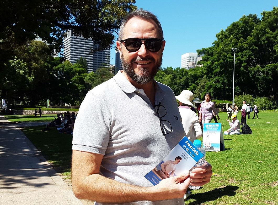 悉尼民众的惊喜 来悉尼参加国际公司在各国的圣诞庆典的生意人瑟基(Seoge Bonnafous)先生是法国人,他正在用手机一边摄像一边传送回法国和亲朋好友分享。他说:“我走过法轮功学员的炼功场时,我感受到轻松和强大的能量场。看到法轮功学员在展示法轮功的五套功法,我非常有兴趣观看和感受,因我在其他城市都看到过,如在美国纽约的中心公园等地方。我还知道法轮功在中国被迫害的事情。希望迫害被尽快结束。”  图5:法国人瑟基(Seoge Bonnafous)先生:希望迫害被尽快结束 |