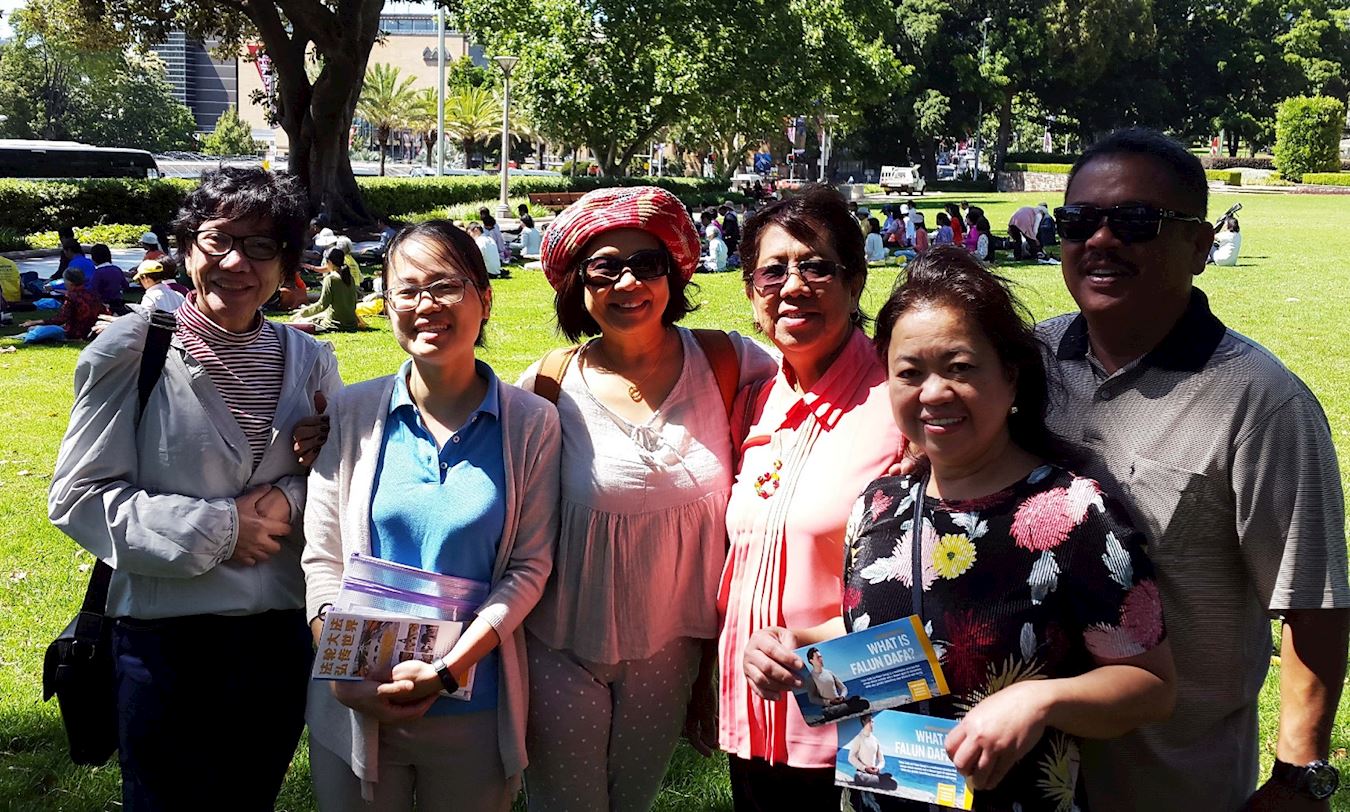 一组来自世界各地的昔年高中同学在悉尼庆祝其中一位的生日,他们从远处走来好奇地询问:这一群如此祥和自律的人,他们在做什么?他们都表示:“学员们的能量场特别好,很吸引我们。他们让人感觉他们非常欢迎每个人,当我们走近时,一位法轮功学员邀请我们,我们马上就想跟着他们学炼法轮功。” 居住在洛杉矶的克里斯蒂娜(Christina)女士和丈夫表示:“我感觉到来自工作的很大压力,所以看到他们在炼功,我马上被祥和的能量场吸引。我要找在洛杉矶的法轮功炼功点。” 来自南澳洲的伊利·阿里(Ely Ali)表示:我想回家去和阿德莱德炼功点法轮功学员一起炼功。 来自菲律宾的罗布丝女士表示(Menchie Robles):“我们只是经过这里,直觉就想学炼,我很真诚地喜欢法轮功,想加入他们,并回去继续学习。”  图6:(左一)罗布丝女士(Menchie Robles),克里斯蒂娜(Christina)女士(右一)和丈夫和来自南澳洲的伊利·阿里(Ali Ela)女士(右三)表示:我们想回家去和当地法轮功学员一起炼功。 |