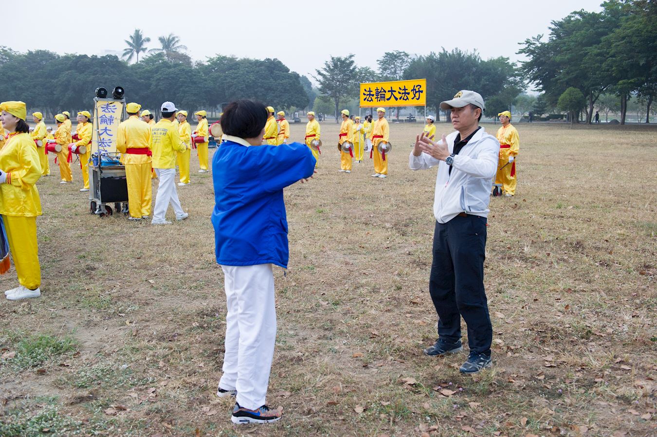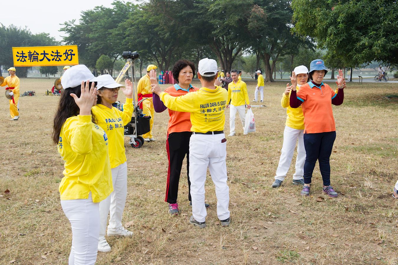 蔡秀宝说,在海洋里活动中心,每周晚七点半,里民们都会一起学习法轮功。她个人从中认知,法轮功是正法大道,其宗旨在弘扬中华文化,提升人类的善良道德,并推动品德教育。 她指出,在与法轮功里民的互动过程,她感受到美好的器宇风范。“这个功法,值得大家一起学习、护持!”她表示,在二零一八年岁末迎新祈福活动中,她愿与学员一起为台湾的明天而努力。 邂逅法轮功 是美好人生的开始  图11:首次邂逅法轮功集会活动的林先生,在法轮功学员的指导下,学习五套至简至易的功法动作。 |