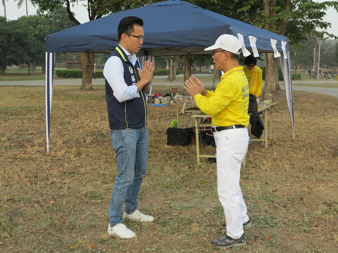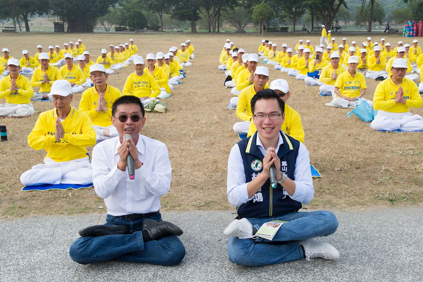 图4:高雄市立法委员许智杰(左)、高市议员林智鸿(右)等,与法轮功学员合十齐颂:“恭祝师尊新年快乐。” |