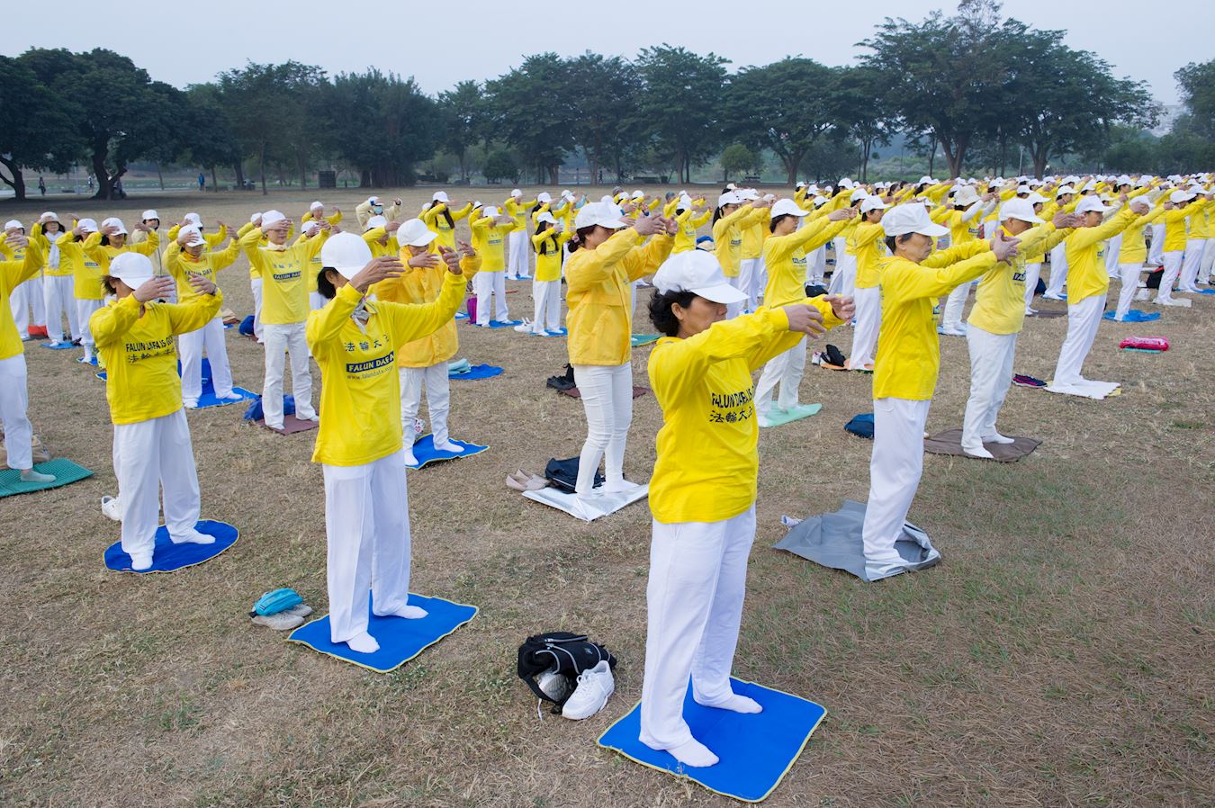 图5~6:二零一九年元旦前夕,高雄市法轮功学员齐聚卫武营都会公园草坪广场集体炼功。 |