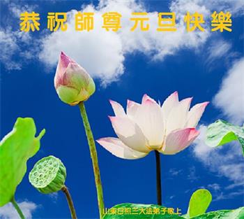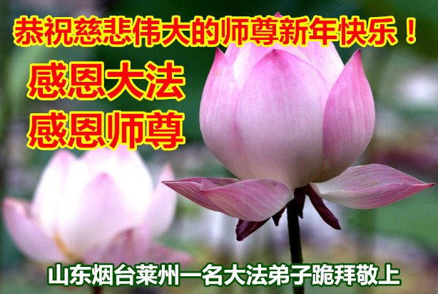 山东省威海市荣成市大法弟子恭祝慈悲伟大的师尊元旦快乐! 每逢佳节倍思亲,在这新年到来之际,弟子更加想念师父。 我修炼前患股骨头坏死,不能走路,生活勉强能自理。得法修炼后不到三个月腿全好了,那真是走路生风,走多远也不累。可惜从九九年“七·二零”后,由于怕心和求安逸之心,没有专一实修,过起常人的舒适生活了,辜负了师父的慈悲苦度,真是后悔莫及。现只有奋起直追,勇猛精進,决心跟师父回家。 弟子含泪叩拜师父,祝师父新年快乐! 山东省威海市荣成市大法弟子恭祝慈悲伟大的师尊元旦快乐!