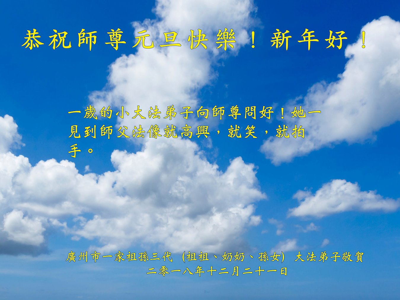 一岁的小大法弟子向师尊问好!她一见到师父法像就高兴,就笑,就拍手。 广州是一家祖孙三代(祖祖、奶奶、孙女)大法弟子敬贺 二零一八年十二月 广东省广州市越秀区一学法小组全体大法弟子祝慈悲伟大的师尊新年快乐!