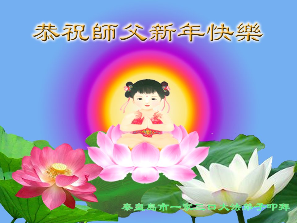 我们在这里问候师尊新年好!我们多学法,多救人,走好最后的路,随师尊回家。叩拜师尊! 河北省秦皇岛一大法弟子及女儿、女婿、外孙女恭祝慈悲伟大的师尊新年好!新年快乐!